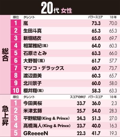 20代では、嵐がグループとしてパワースコア1位。2位の生田斗真は10代でも9位に入っており、音楽活動などをしない専業の俳優としては両世代でトップという結果だった。今年3月から劇団☆新感線の舞台『偽義経冥界歌』に出演したことで、調査時期にバラエティ番組へのゲスト出演が増えたことでも注目度が増した。女優では新垣結衣と石原さとみがトップ5入り。10代でも新垣が6位、石原が8位に入っている。ともに30代で、年下の同性にとって憧れの存在がこの2人だと言えるだろう。SNSフォロワーが多いことで知られる渡辺直美は8位で、20代では芸人から唯一のトップ10入り。同性からの人気が高いことを示した。急上昇3位、4位には、King & Princeの平野紫耀と髙橋海人が並んでいる。